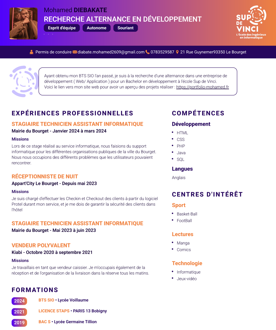 Je m'appelle Mohamed DIEBAKATE, j'ai obtenu mon BTS SIO SLAM au lycée Voillaume à Aulnay-Sous-Bois en 2024.